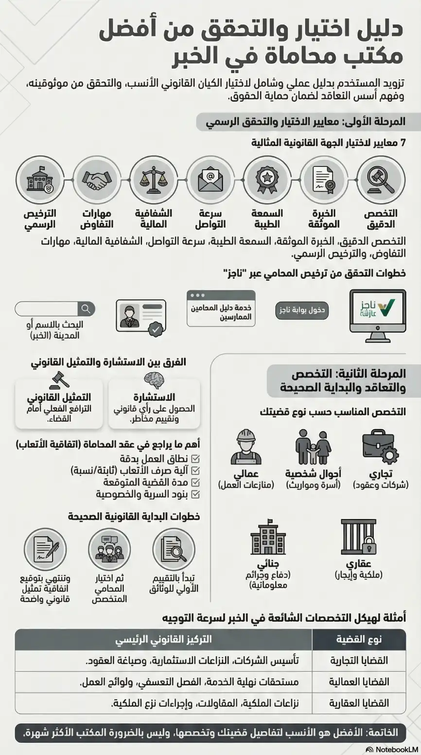 في هذا المقال، يُستخدم تعبير أفضل مكتب محاماة في الخبر بوصفه عبارة بحث شائعة، لا بوصفه ترتيباً دعائياً لمكاتب بعينها. لذلك ستجد هنا دليلاً معلوماتياً يساعدك على التقييم الذاتي وفق معايير الترخيص، التخصص، نطاق الخدمة، آلية المتابعة، وبنود التعاقد، مع الاعتماد على المصادر الرسمية السعودية دون ترشيح أسماء محددة.